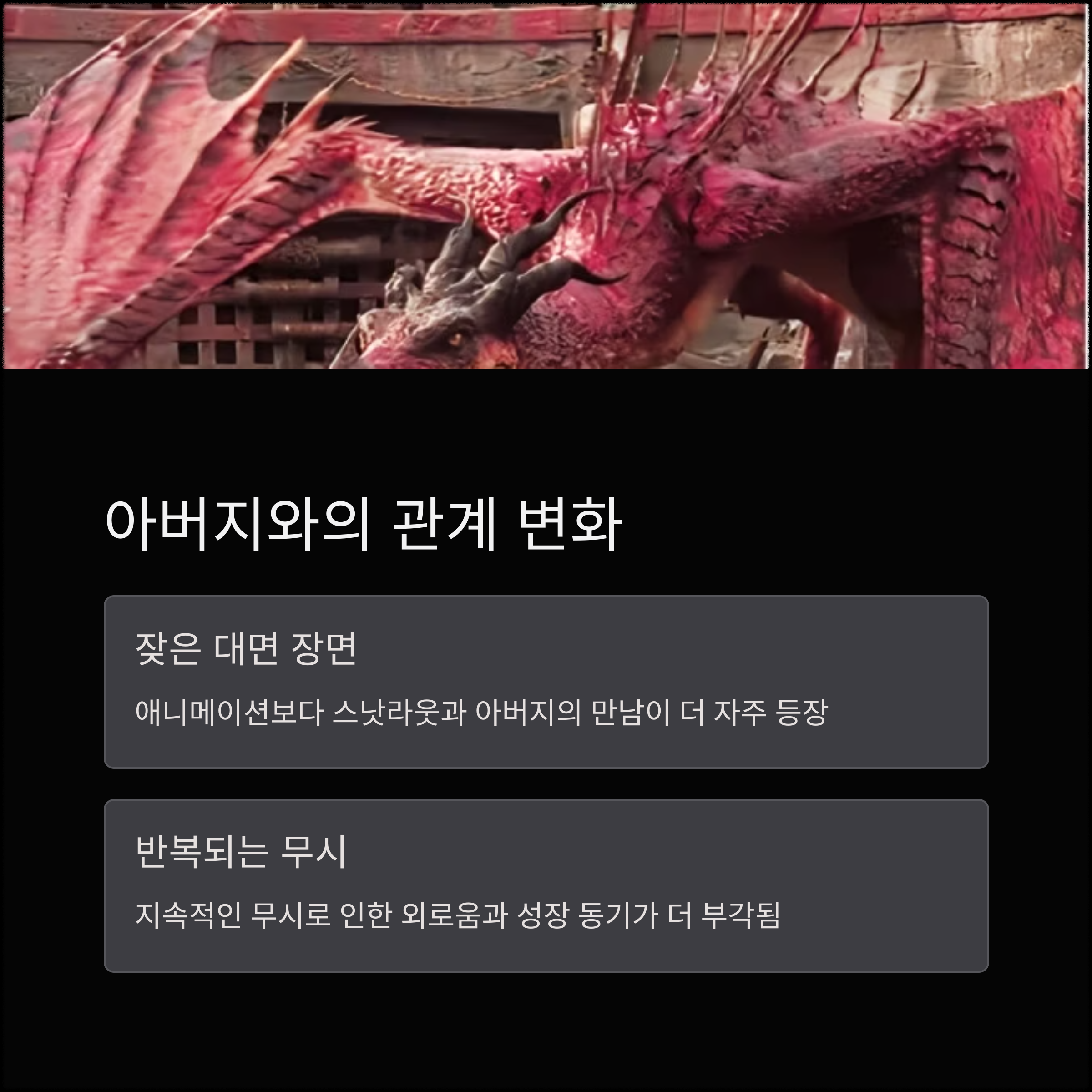 반면 스토이크와 히컵 간의 감정적 화해 장면은 실사판에서 변명조 대사로 대체되어 더 현실적인 부자의 갈등이 강조된다