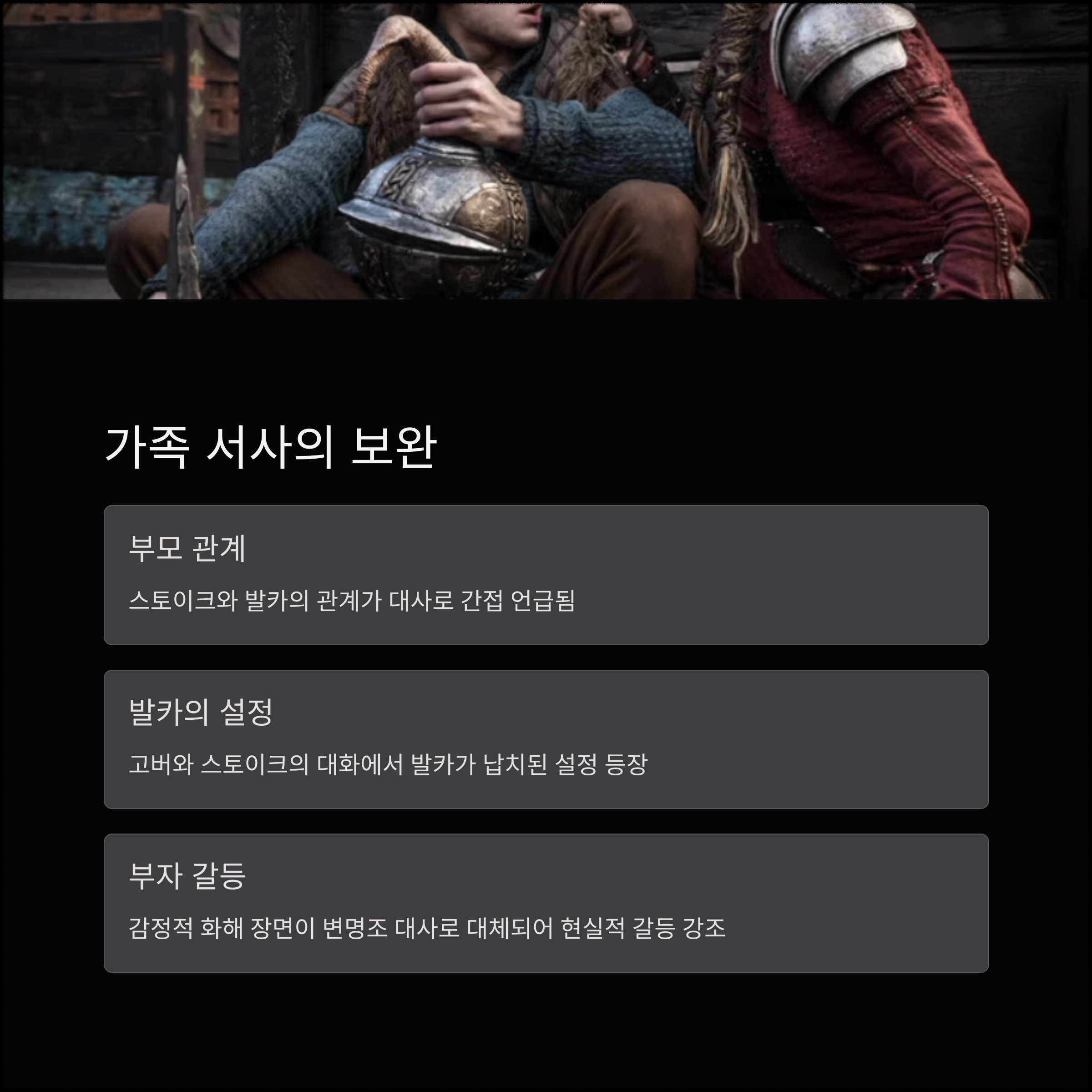 고버와 스토이크의 대화에서도 발카가 납치된 설정이 등장하여 가족 서사가 더 풍성해진다