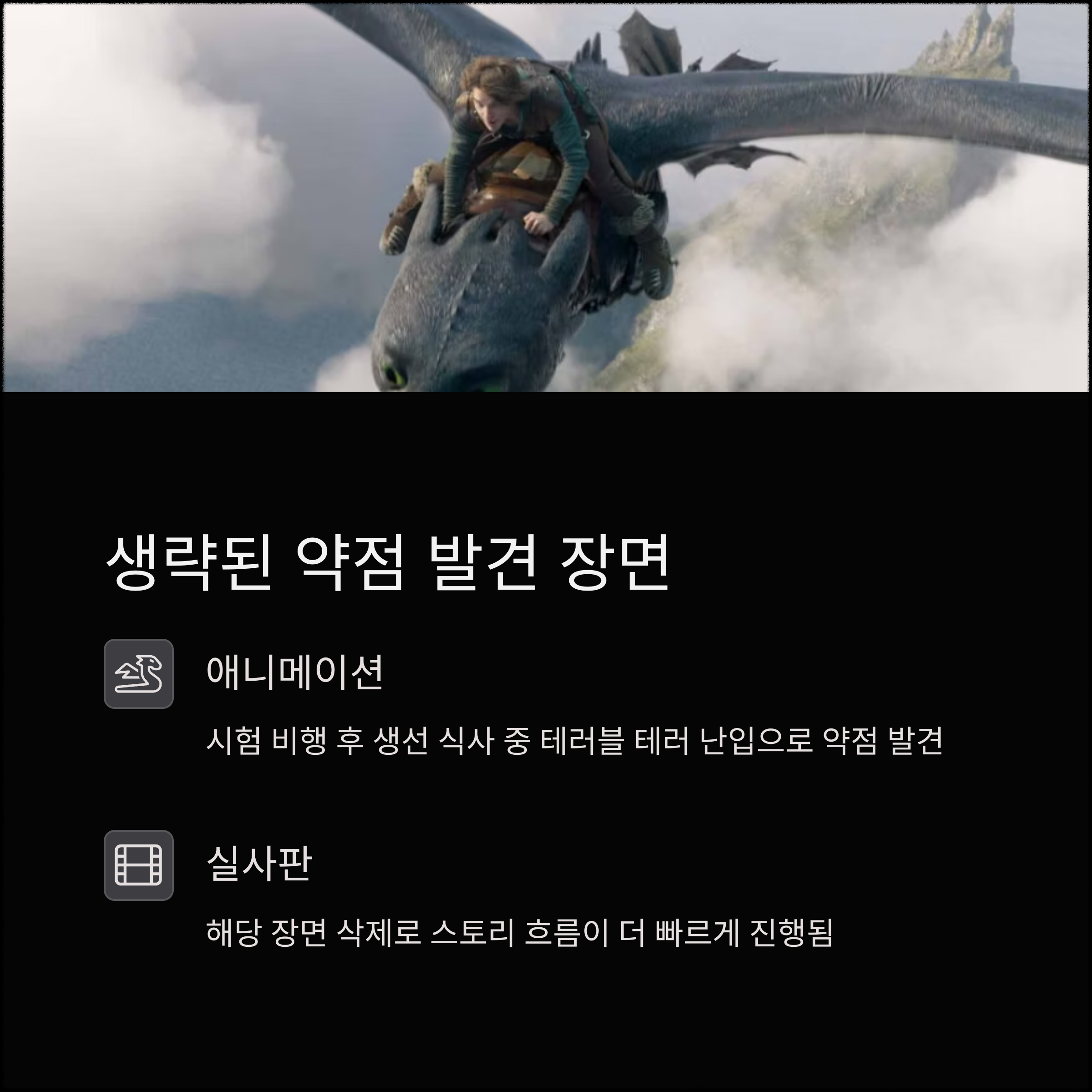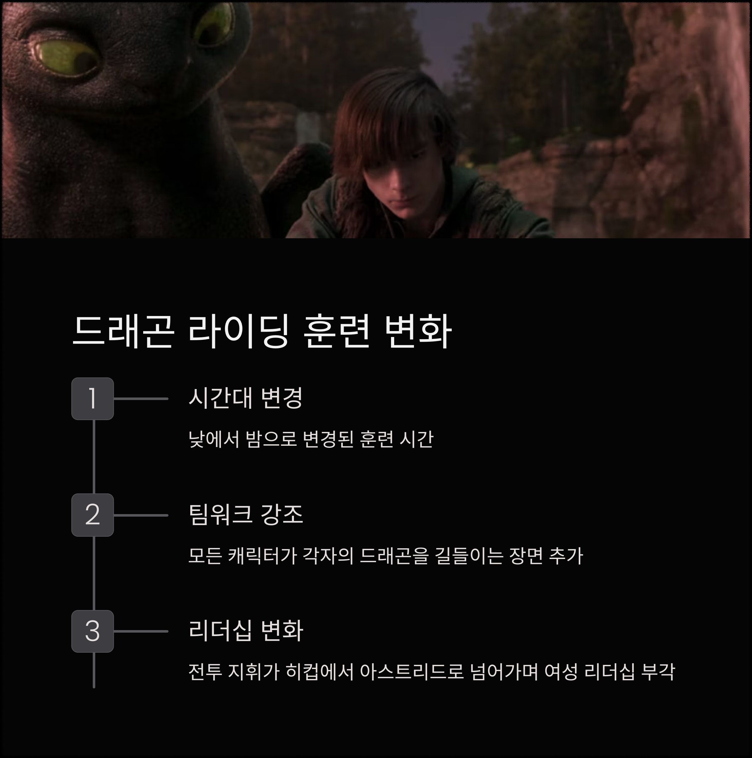 첫 드래곤 훈련 후, 히컵이 아스트리드에게 드래곤 사전을 같이 읽자고 제안하는 장면에서 큰 변화가 있다