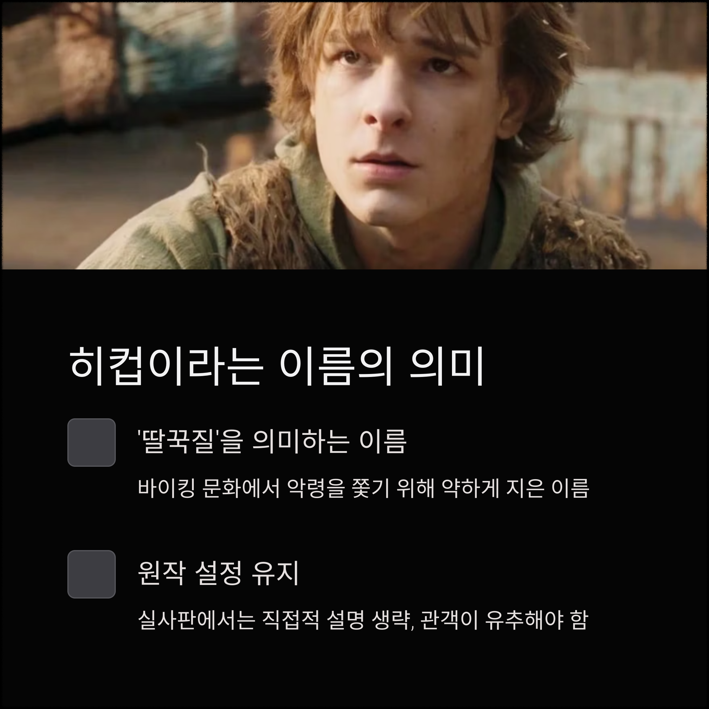 원작처럼 바이킹 문화에서 갓난아이가 악령을 쫓기 위해 일부러 약하게 지은 이름이라는 설정은 유지된다