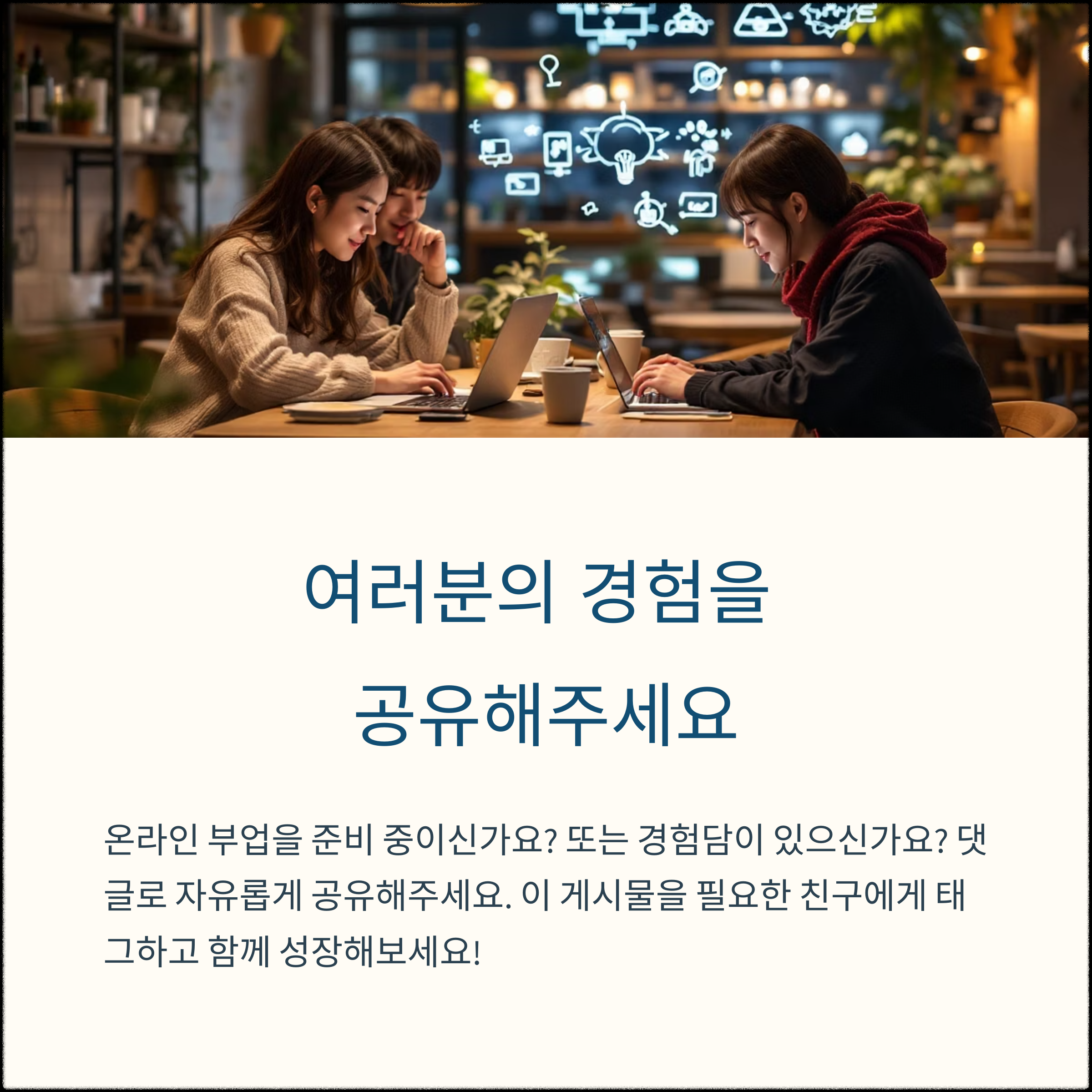 온라인 부업을 준비 중이신가요? 또는 경험담이 있으신가요? 아래 댓글에 자유롭게 공유해주세요. 여러분의 참여가 더 풍부한 정보를 만드는 데 큰 힘이 됩니다.