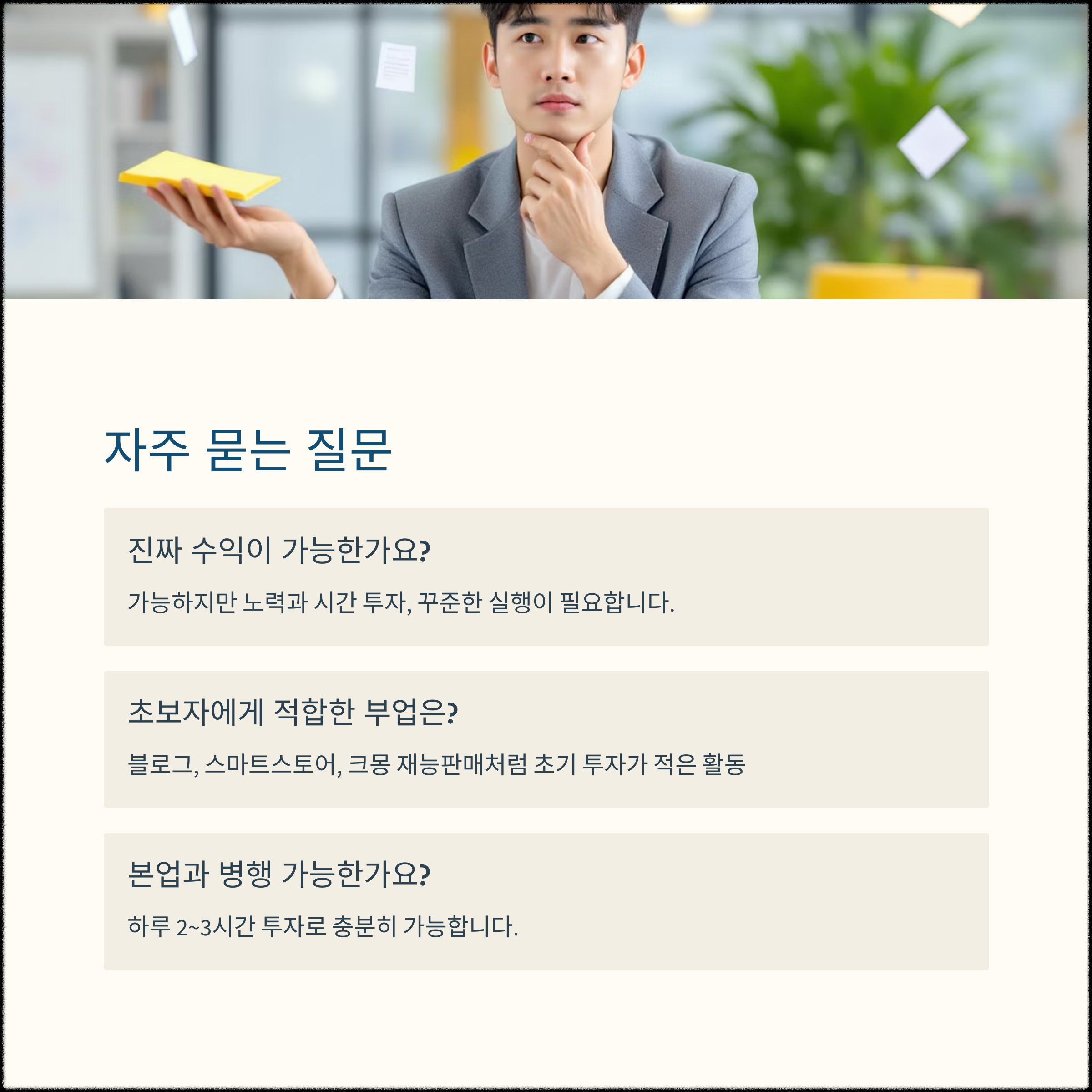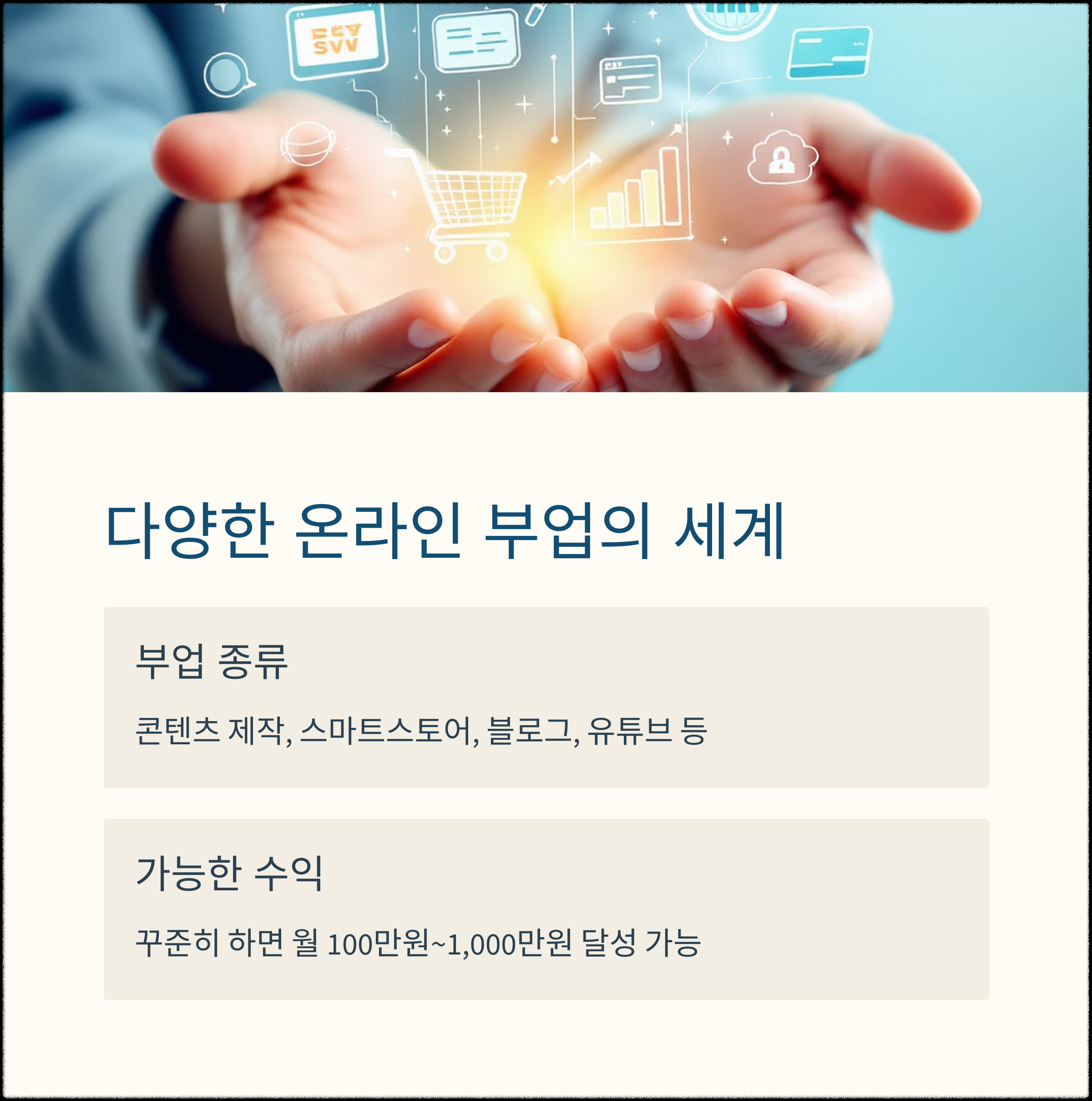 | 온라인 부업 종류 | 콘텐츠 제작, 스마트스토어, 블로그, 유튜브 등 다양함 |
