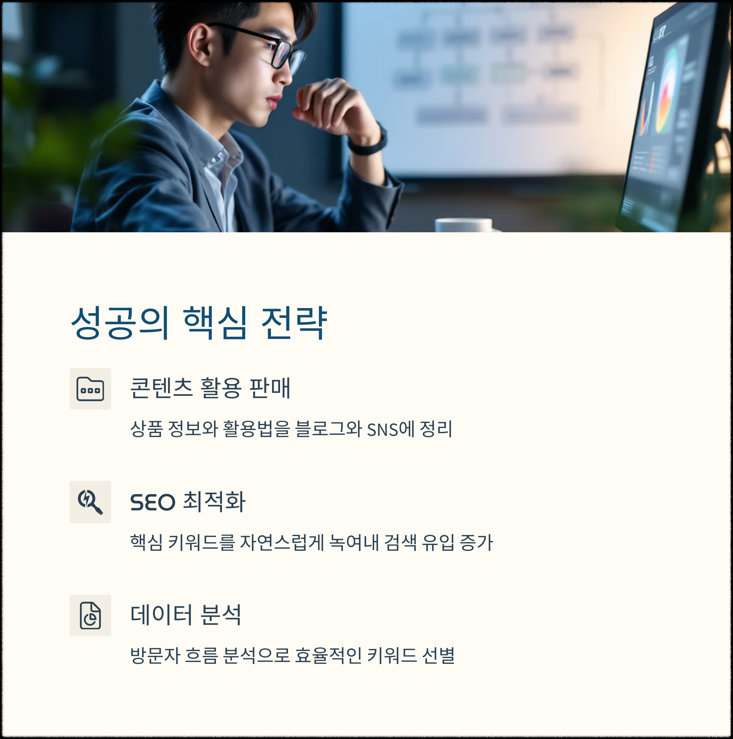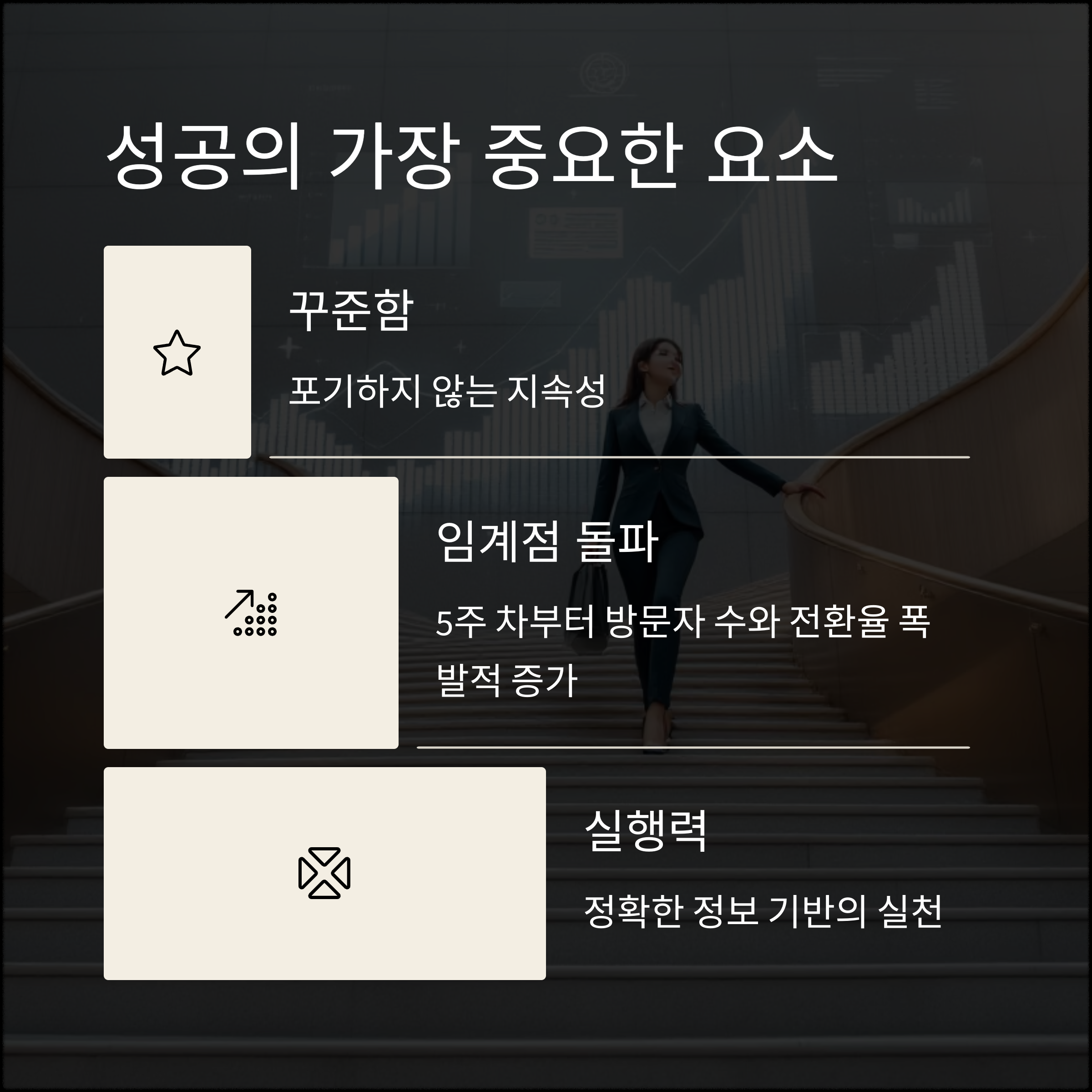 지금 돌이켜보면 가장 중요한 요소는 꾸준함이었습니다. 많은 사람들이 초반에 수익이 없다고 포기하지만, 실제 수익은 일정 임계점을 넘어서야 나타납니다. 저 역시 4주간 매출 10만 원을 넘기지 못했지만, 5주 차부터는 누적 방문자 수와 구입 전환율이 폭발적으로 늘었습니다. 꾸준히 키워드 SEO를 적용</strong하고, 방문자 맞춤형 콘텐츠를 생산했으며, 고객 리뷰를 콘텐츠로 다시 활용하여 신뢰도를 높였습니다. 이 과정을 반복하면서 결국 16주 차에는 월 매출이 천만 원을 돌파하게 되었죠. 중요한 것은 정확한 정보 기반의 실행력과 포기하지 않는 지속성입니다.