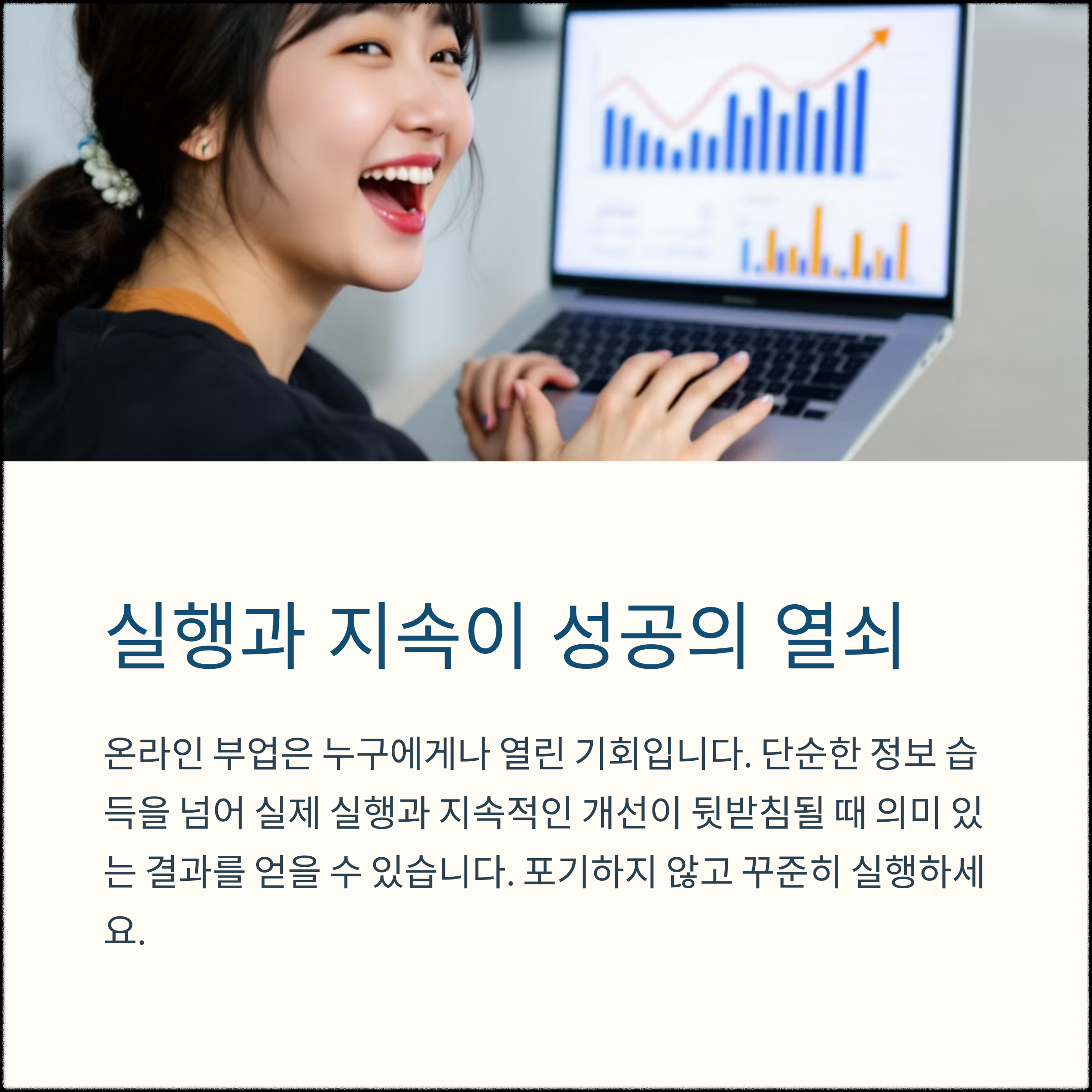 온라인 부업은 누구나 시작할 수 있는 열린 기회입니다. 하지만 단순한 정보 습득으로 끝내지 않고, 실제 실행과 지속적인 관찰, 개선이 뒷받침될 때 의미 있는 결과를 얻게 됩니다. 저의 16주 실전 경험이 그 증거이며, 이 글을 읽는 여러분도 자신만의 길을 만들어 나갈 수 있습니다. 포기하지 않고, 꾸준히 실행한다면 분명 원하는 수익과 자율성을 얻을 수 있습니다.