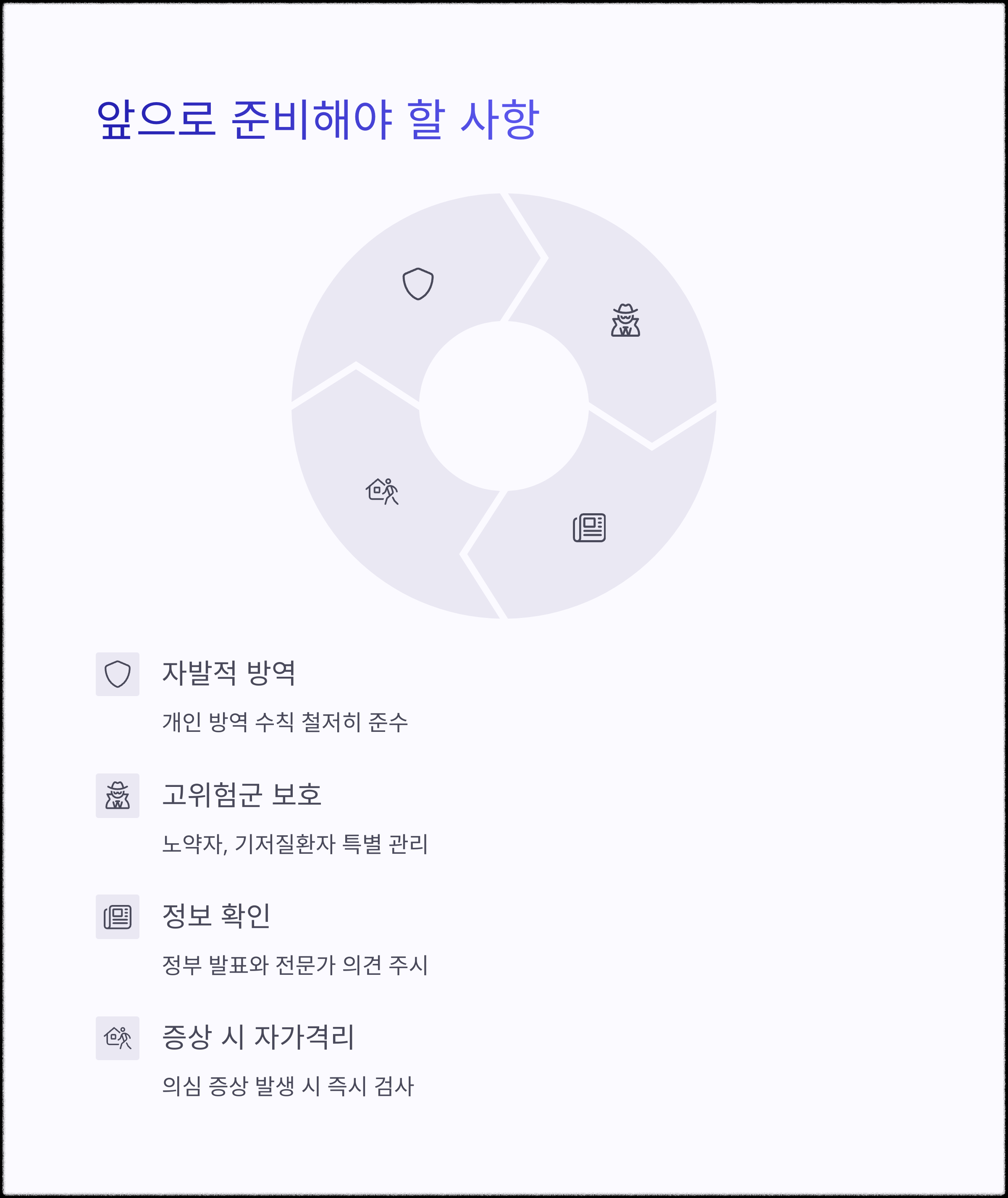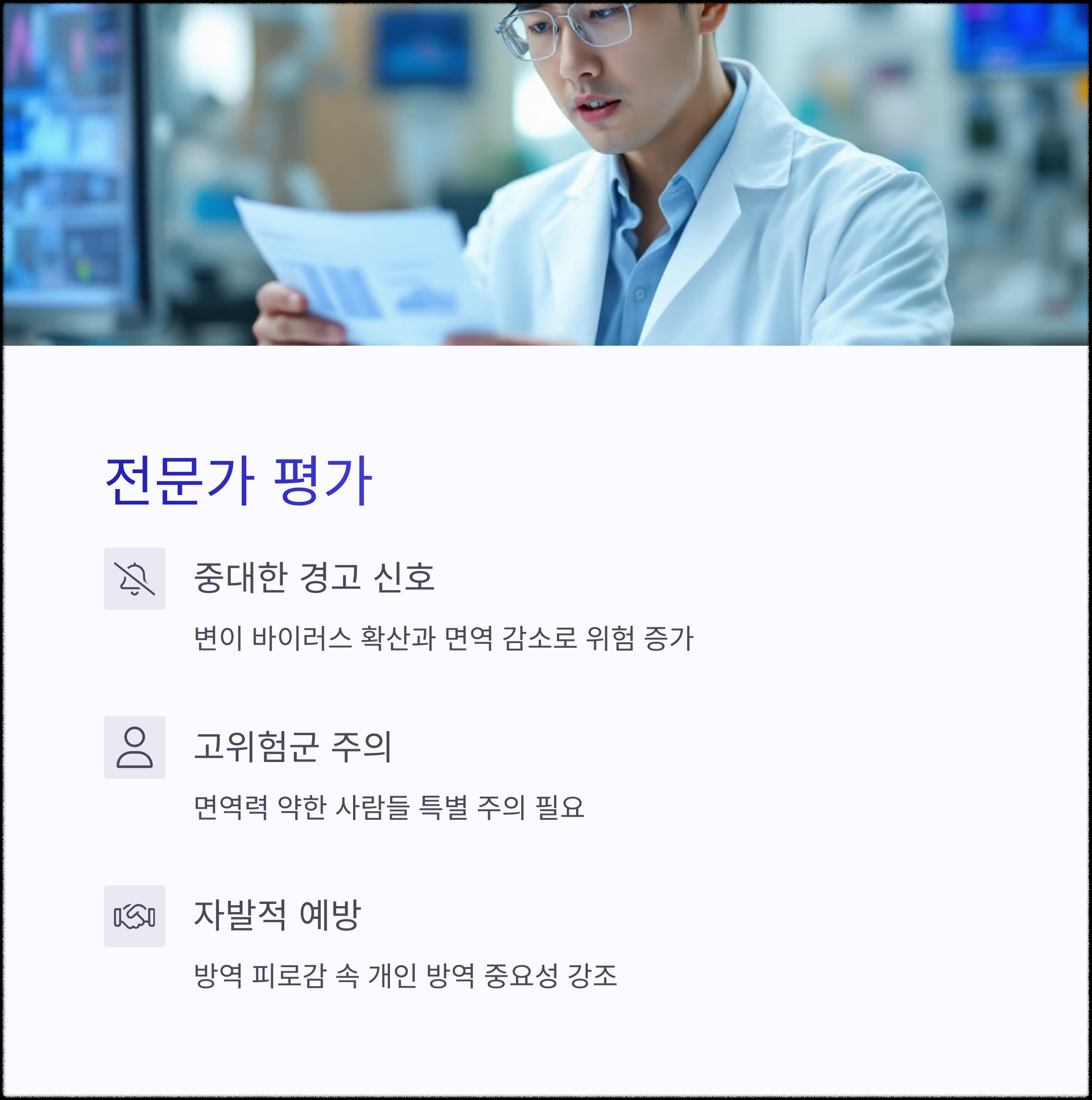 따라서 국민들은 "자발적인 방역 실천과 고위험군 보호에 적극 동참해야 한다"는 점이 강조되고 있습니다.