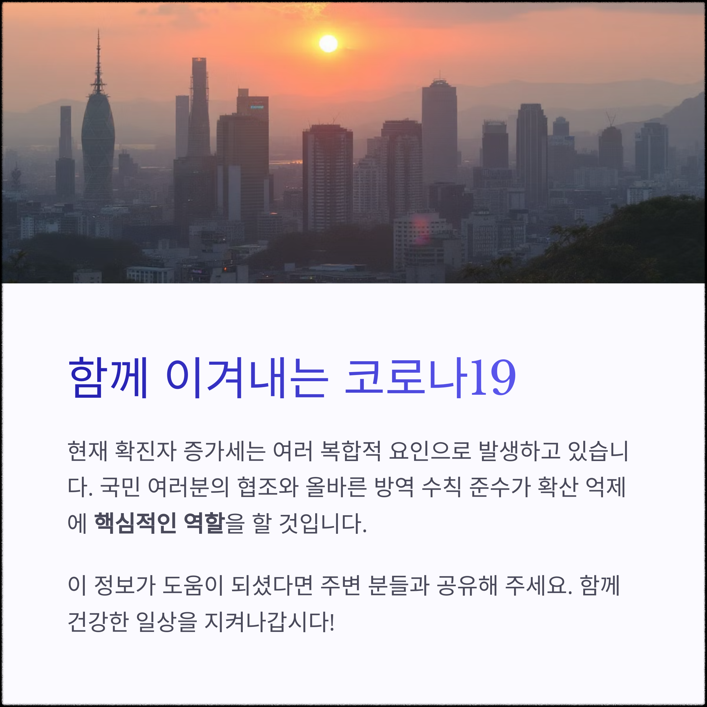 앞으로도 정부 발표와 전문가 의견을 주의 깊게 참고하시고, 개인 방역에 최선을 다해주시기 바랍니다.