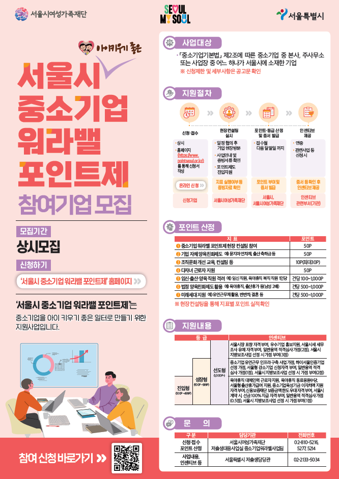 서울시는 대기업과 달리 육아휴직 제도 활용이 어려운 중소기업 직원을 위해 ‘중소기업 워라밸 포인트제’를 도입했습니다. 특히 육아휴직 대체인력 지원, 동료응원수당, 출산휴가 급여 지원 등 인센티브 3종 세트를 통해 기업의 자발적 참여를 유도하고 있습니다.