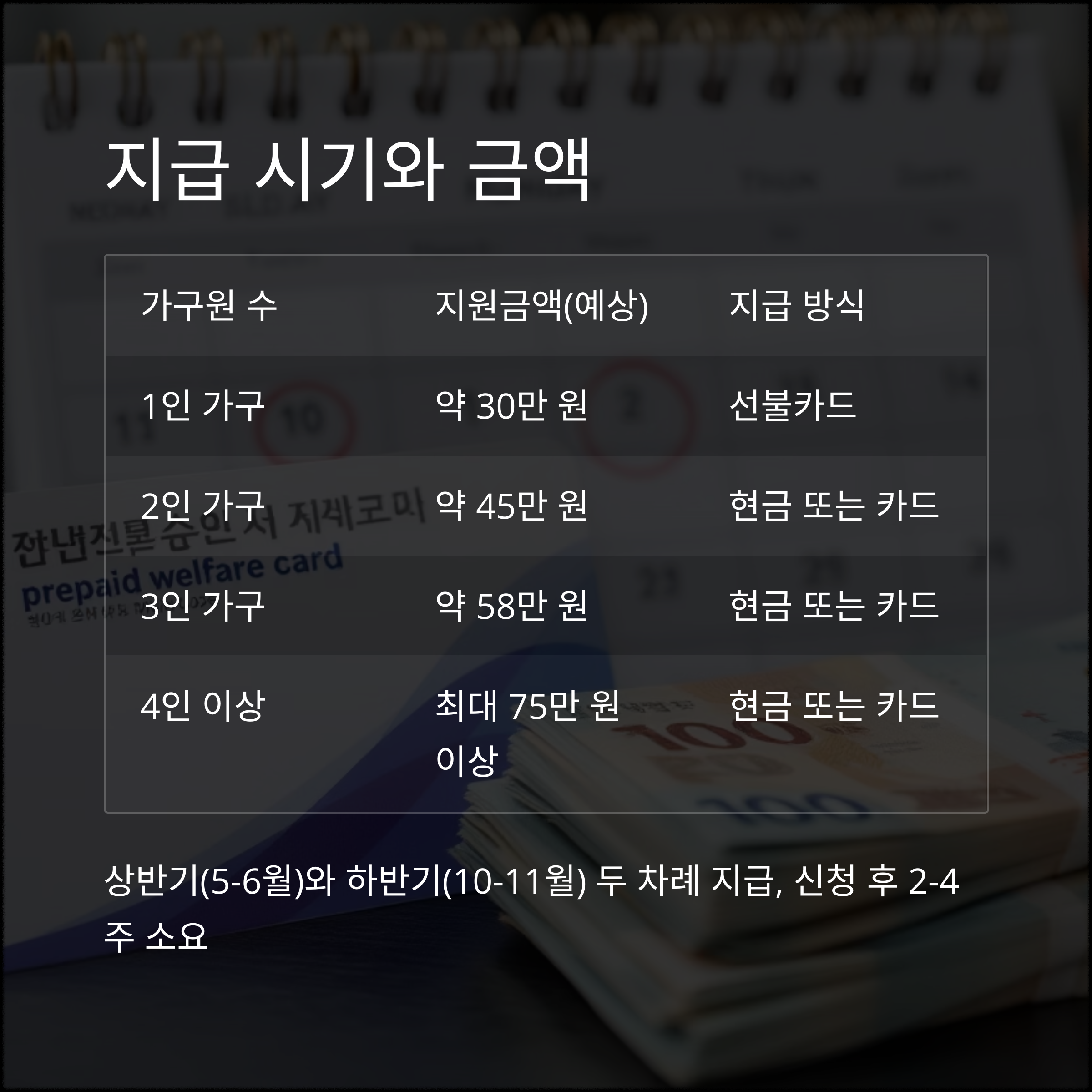 각 시기에는 신청 후 약 2주~4주 내에 현금 또는 선불형 복지카드로 지급됩니다.