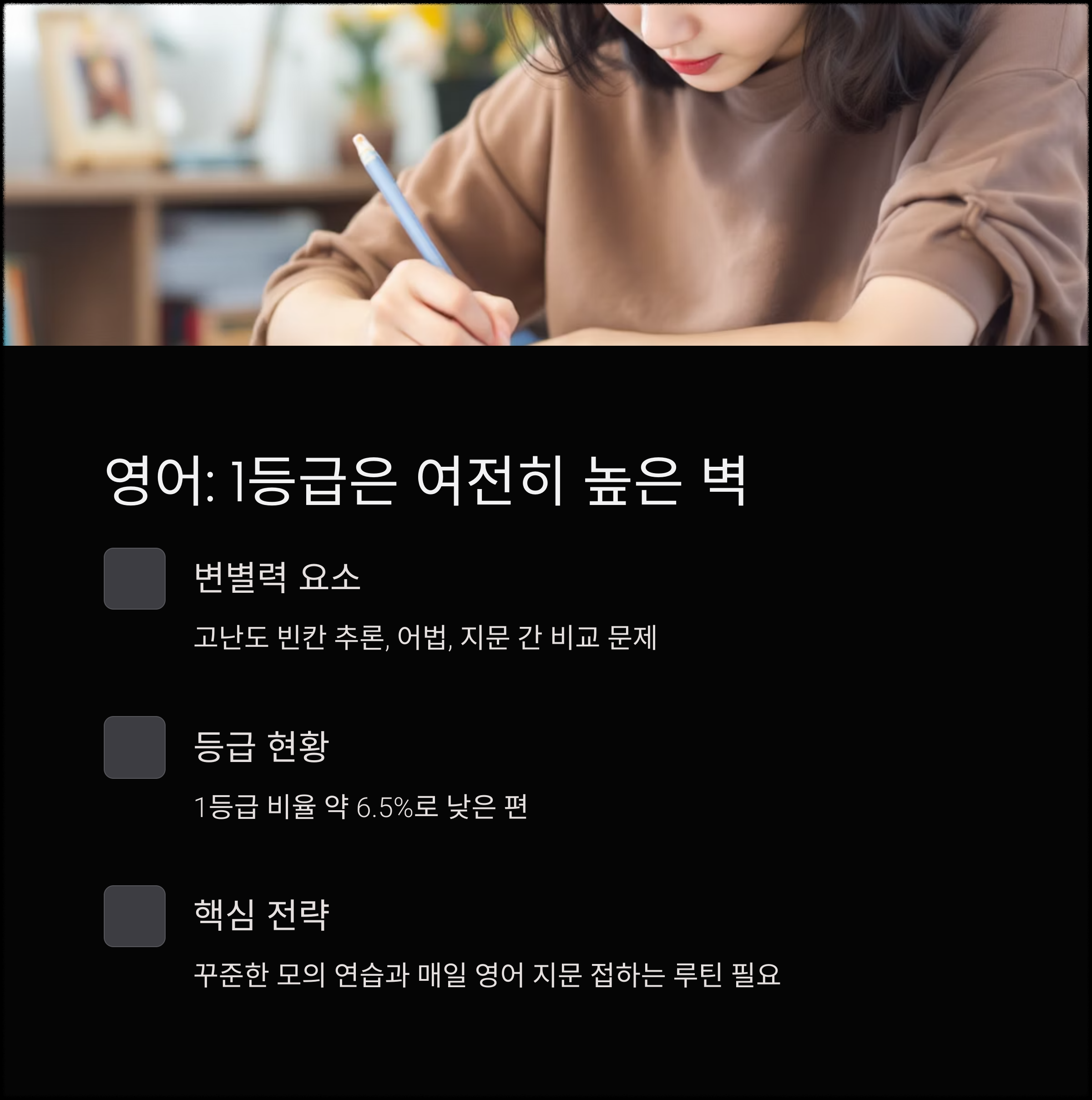 핵심 전략: 꾸준한 모의 연습과 문장 구조 파악이 중요하며, 매일 영어 지문을 접하는 루틴이 필요합니다.