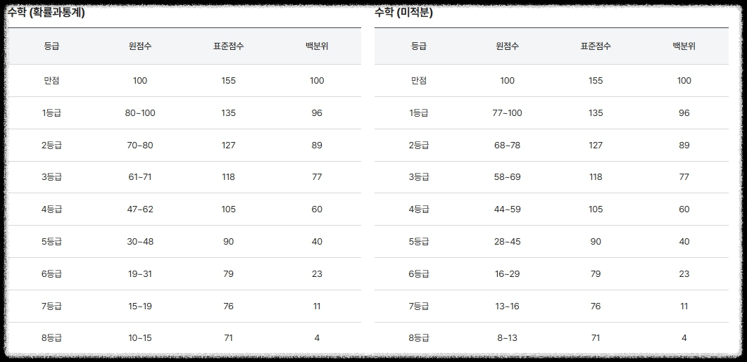 수학은 확률과통계, 미적분, 기하 중 선택과목 간 점수 차이가 뚜렷하게 나타났으며, 미적분을 선택한 수험생의 상위 점수 비율이 높았습니다. 공통 과목(수1, 수2)은 상대적으로 평이했으나, 문제 풀이 속도와 실수 방지가 등급에 결정적인 영향을 미쳤습니다.
