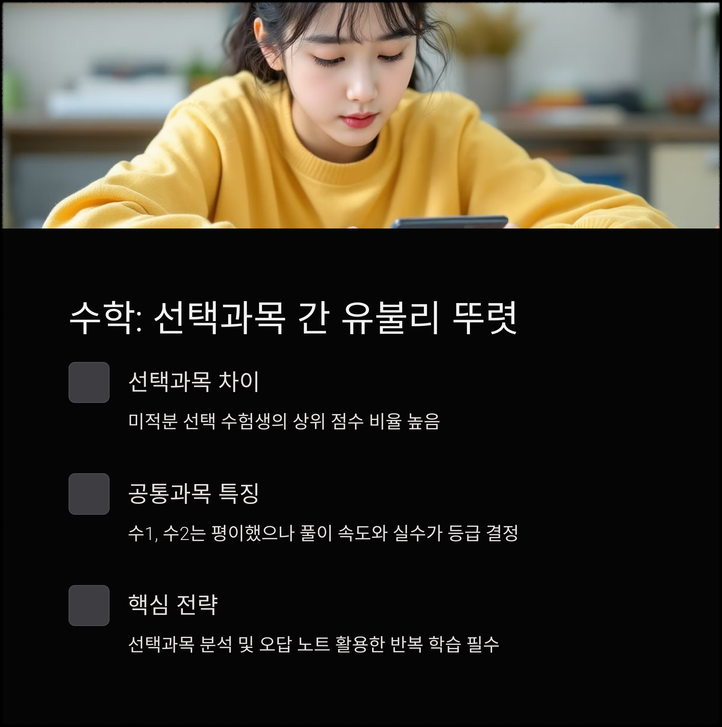 핵심 전략: 선택과목별 전형 요소 분석 및 실수 방지를 위한 훈련 필요. 오답 노트를 활용한 반복 학습이 필수입니다.