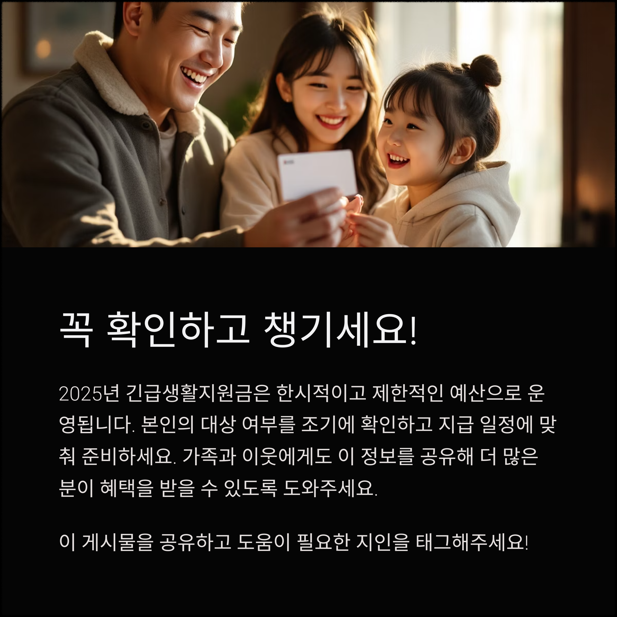 필수 정보는 공유하고, 가족·이웃과 함께 확인해 더 많은 분이 혜택을 받는 것이 바람직합니다.