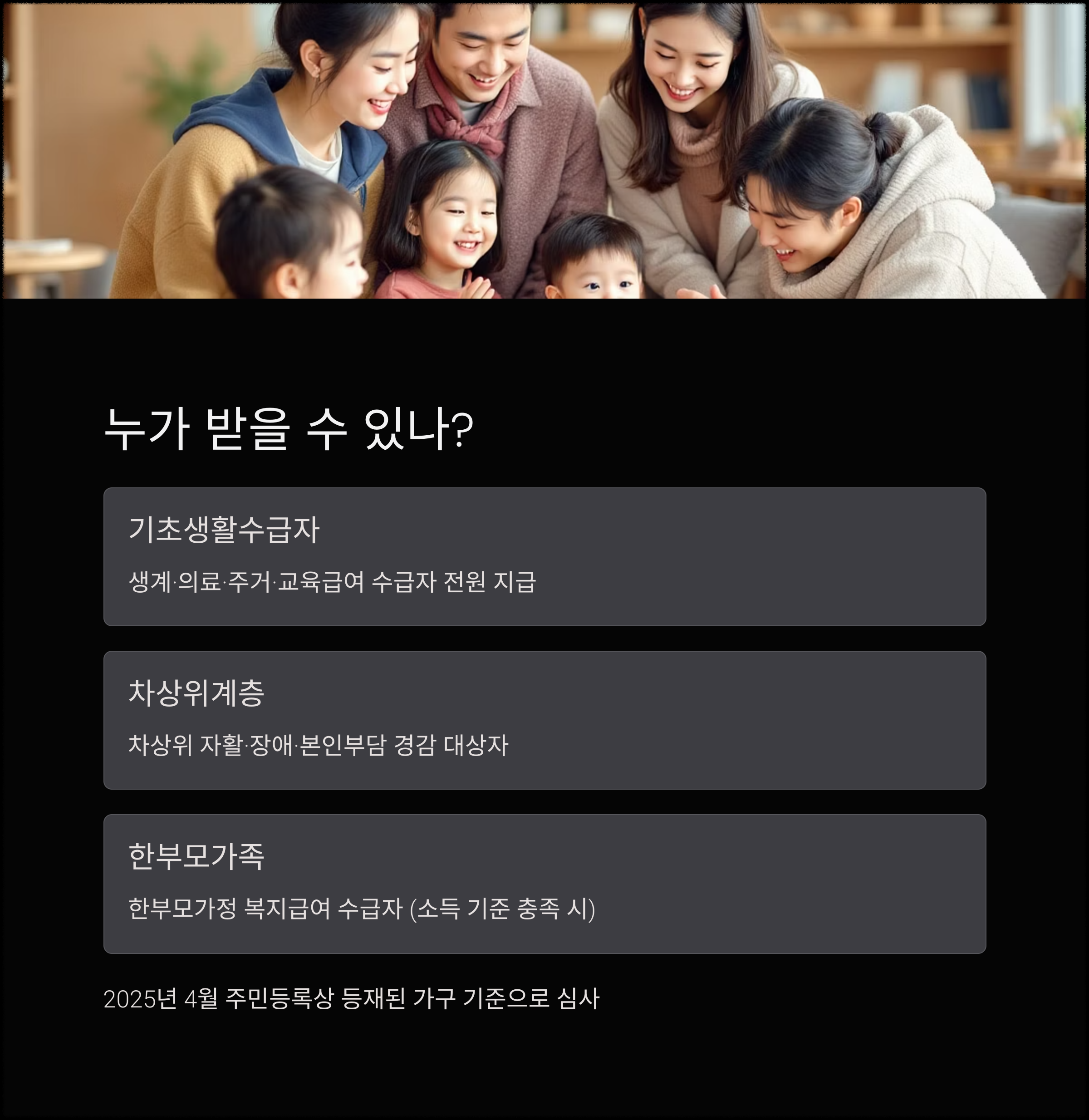 핵심 기준은 "2025년 4월 주민등록상 등재된 가구 기준"이며,