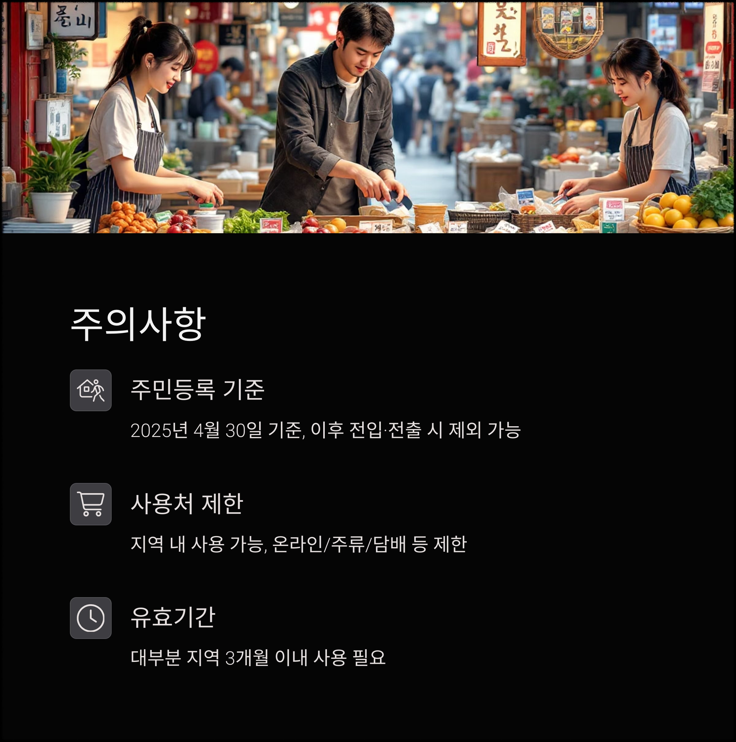 지역 내 대형마트, 편의점, 전통시장 등에서 사용 가능하며
