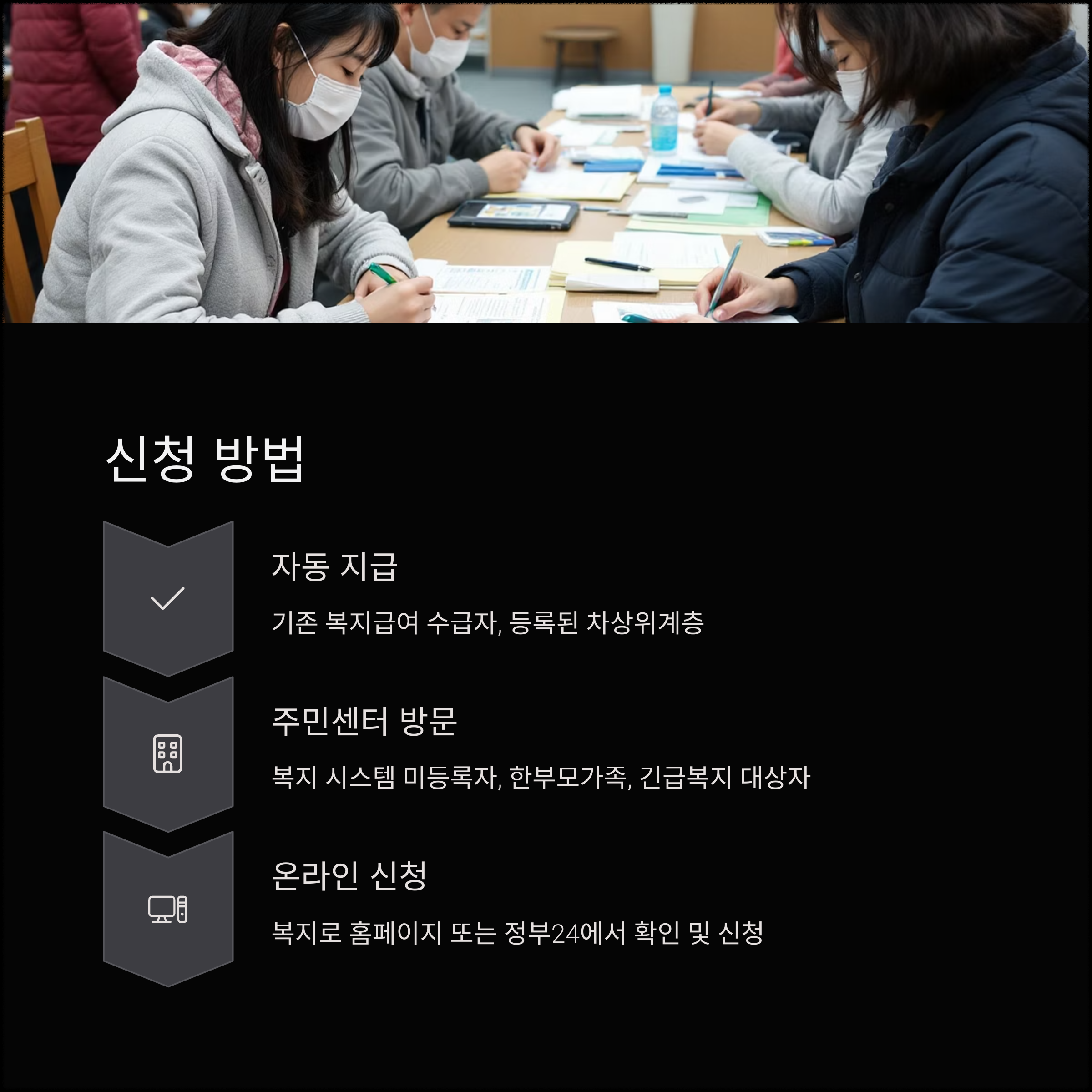 이미 복지급여 수급자이거나 지자체에 등록된 차상위계층은 별도 신청 없이 지급됩니다.