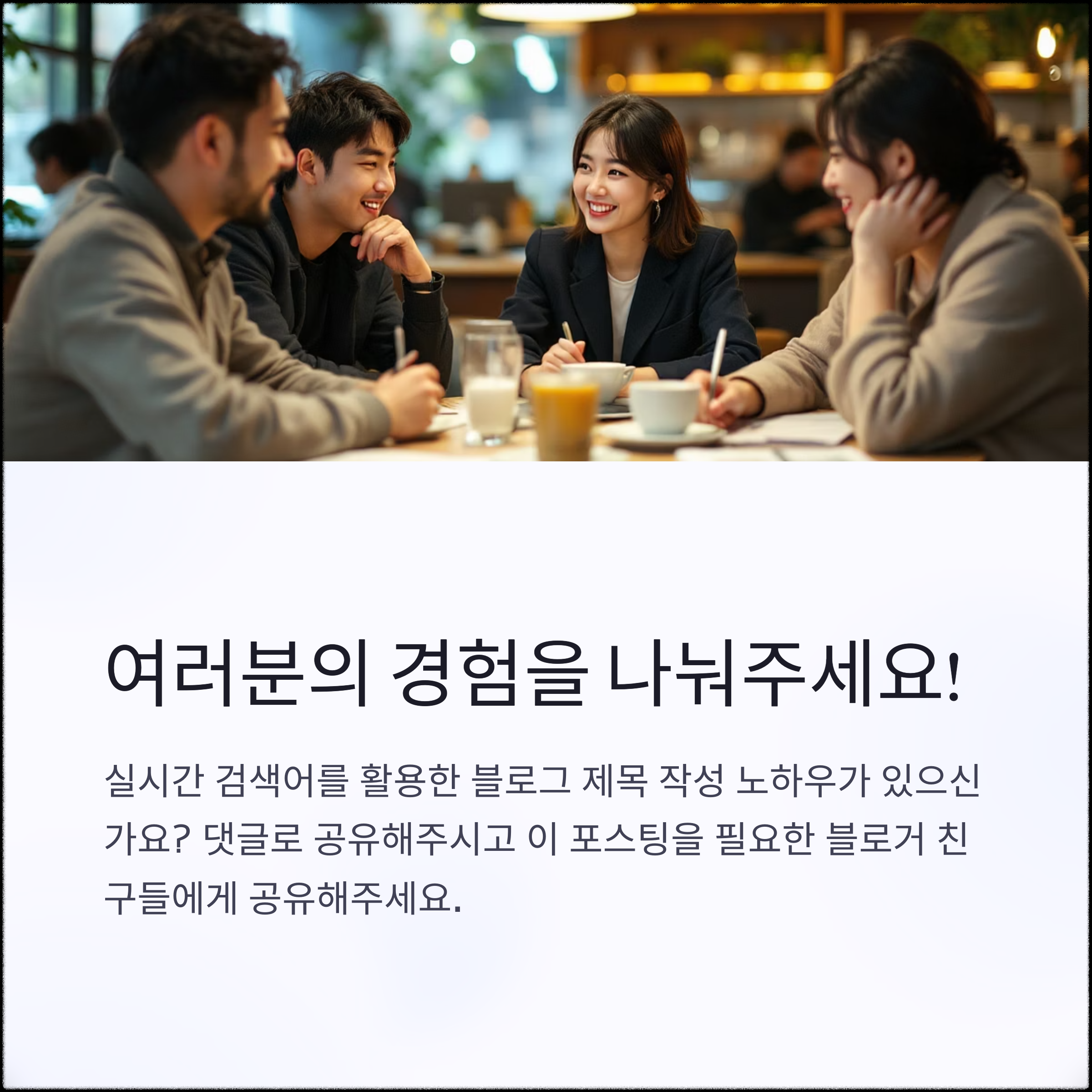 여러분은 실시간 검색어를 어떻게 활용하고 계신가요? 제목 작성에 대한 노하우나 궁금한 점이 있다면 댓글로 자유롭게 나눠주세요. 함께 성장하는 블로거가 되고 싶습니다.