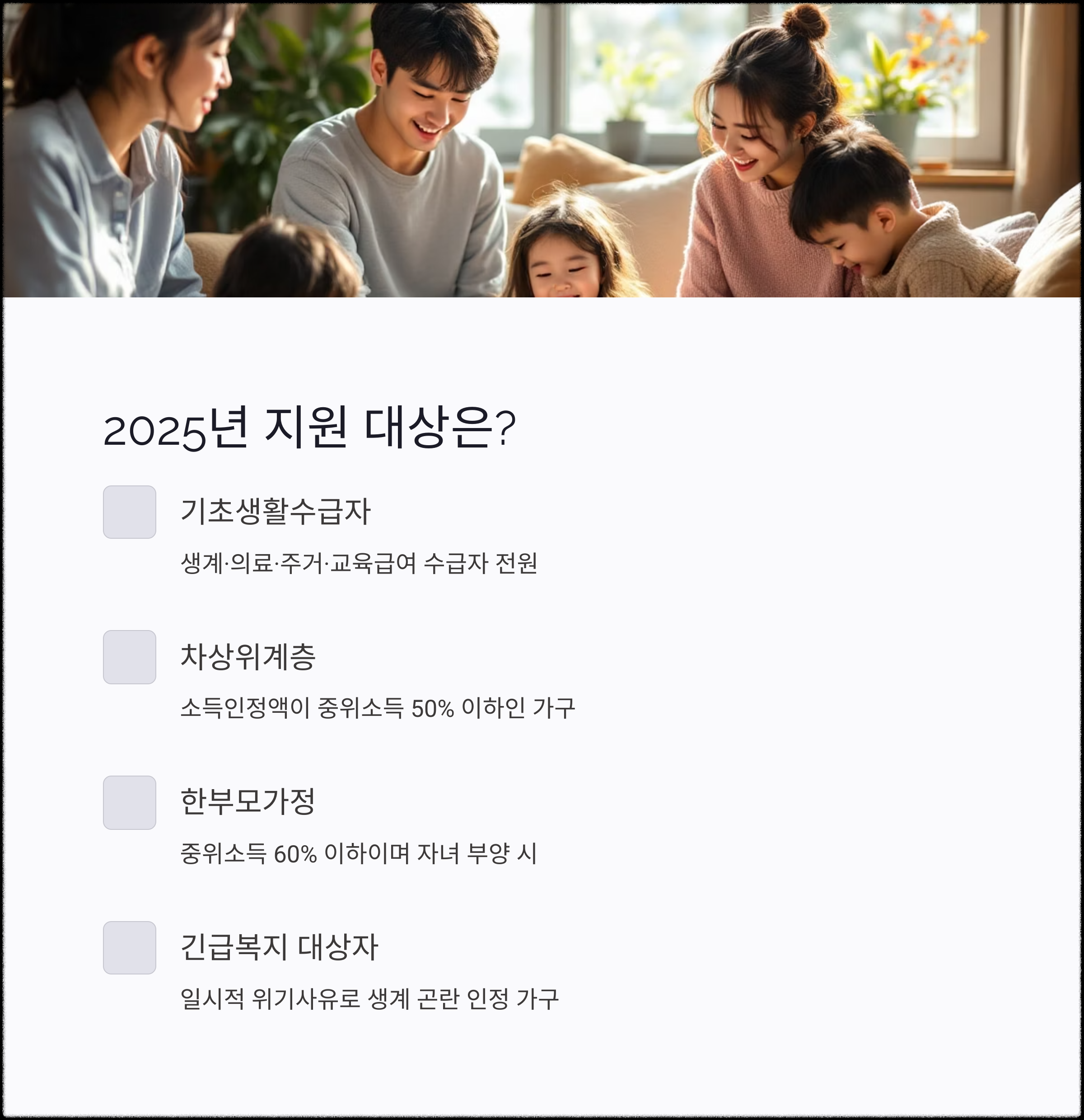 2025년에는 기초생활수급자, 차상위계층, 한부모가정 중심으로 확대 지급됩니다.