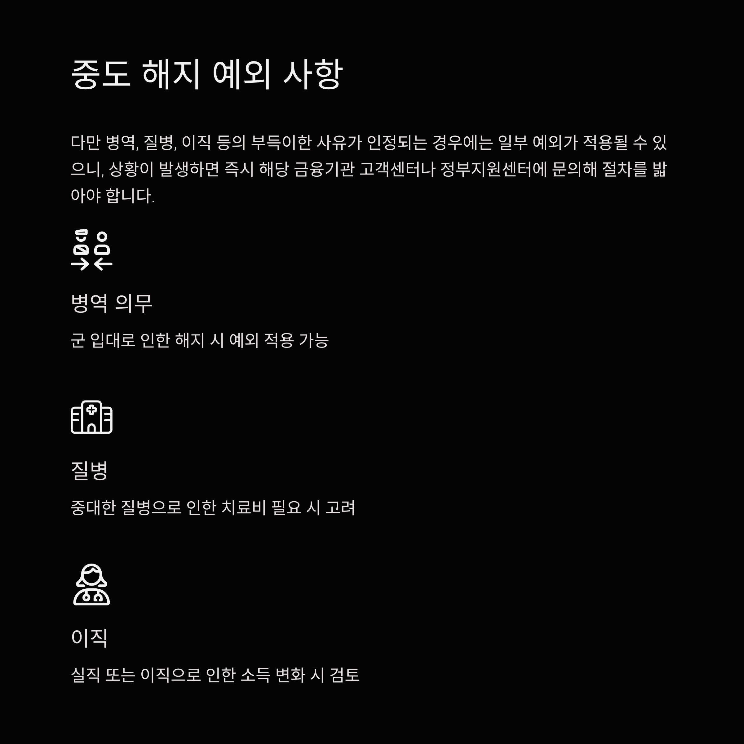 다만 병역, 질병, 이직 등의 부득이한 사유가 인정되는 경우에는 일부 예외가 적용될 수 있으니, 상황이 발생하면 즉시 해당 금융기관 고객센터나 정부지원센터에 문의해 절차를 밟아야 합니다.