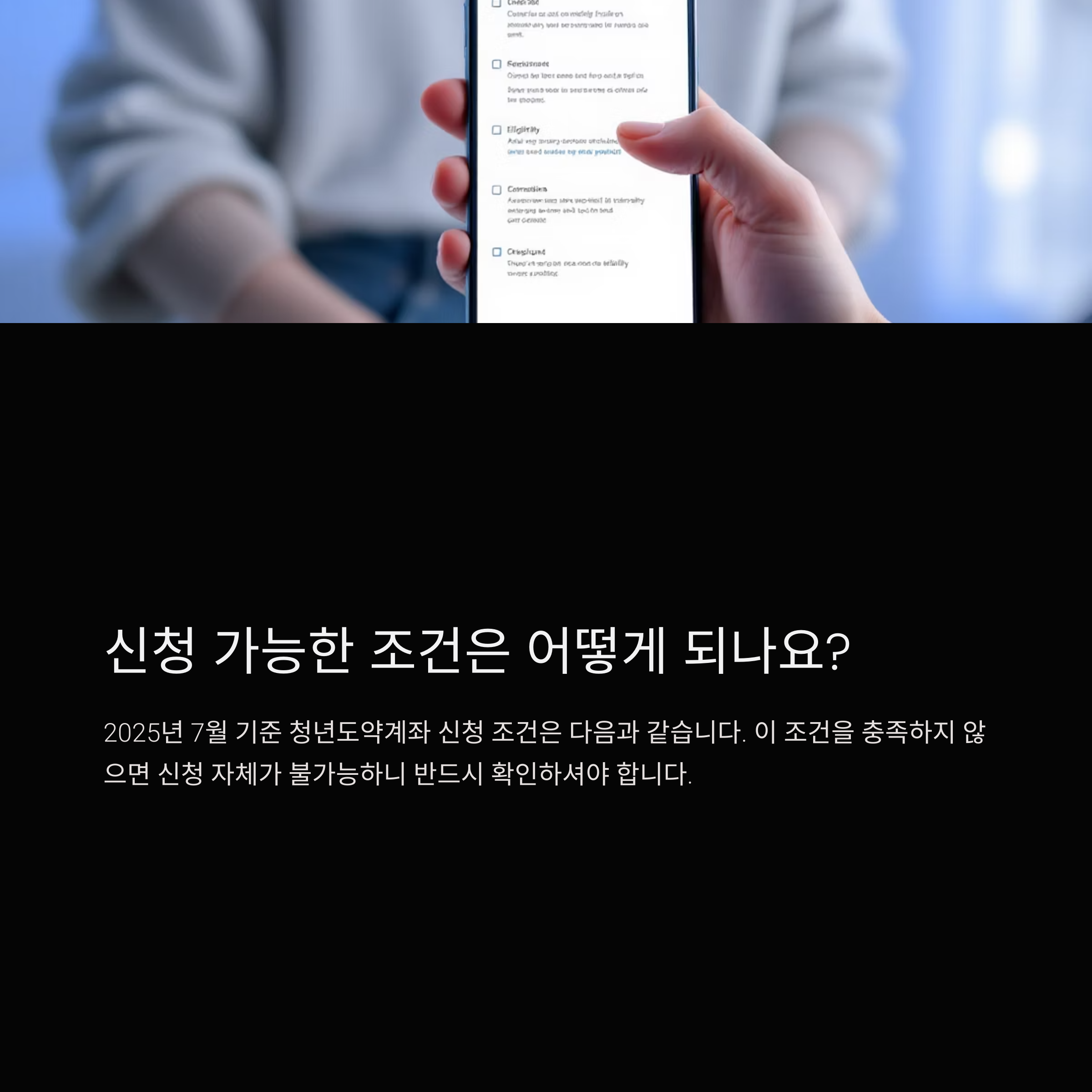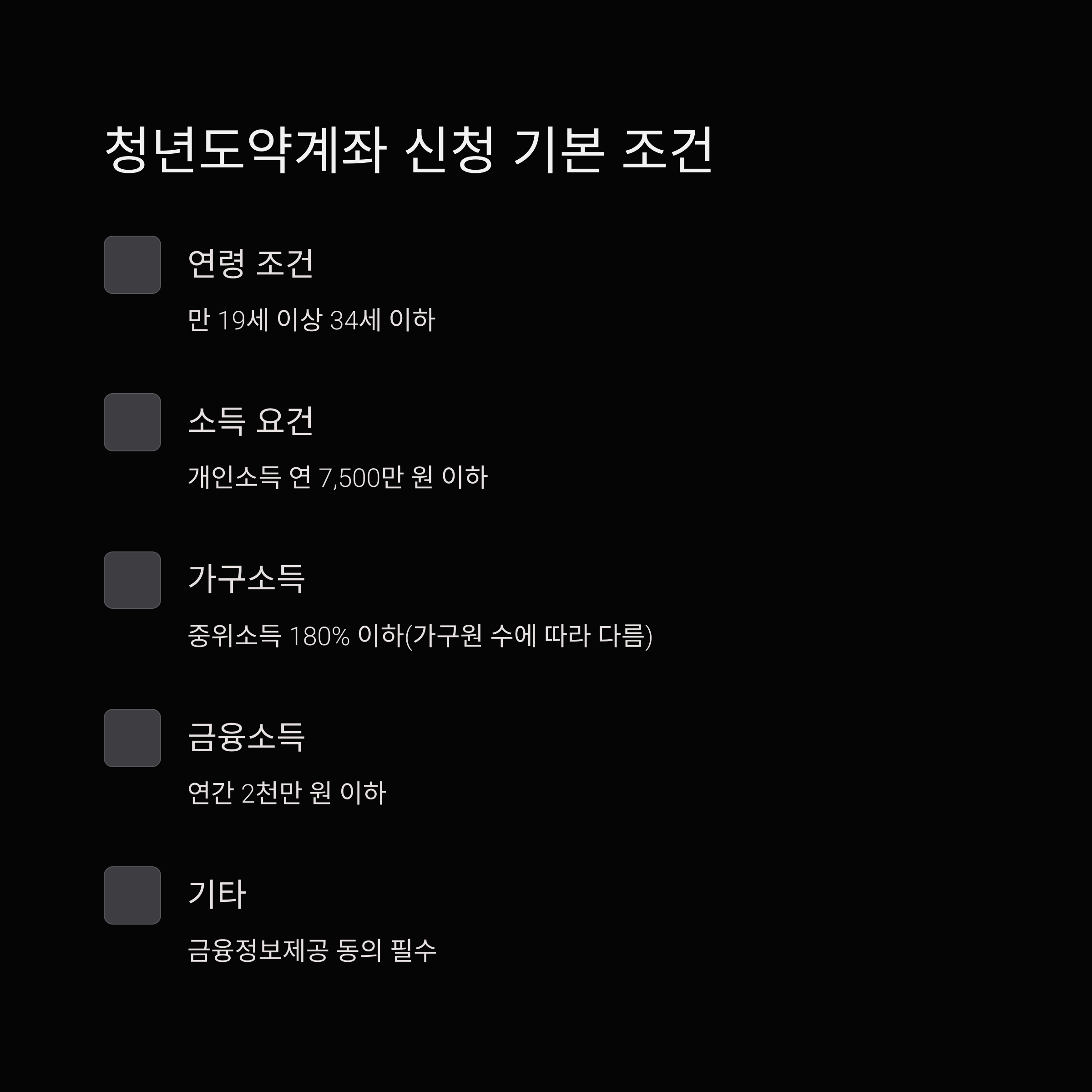 2025년 7월 기준 청년도약계좌 신청 조건은 다음과 같습니다.