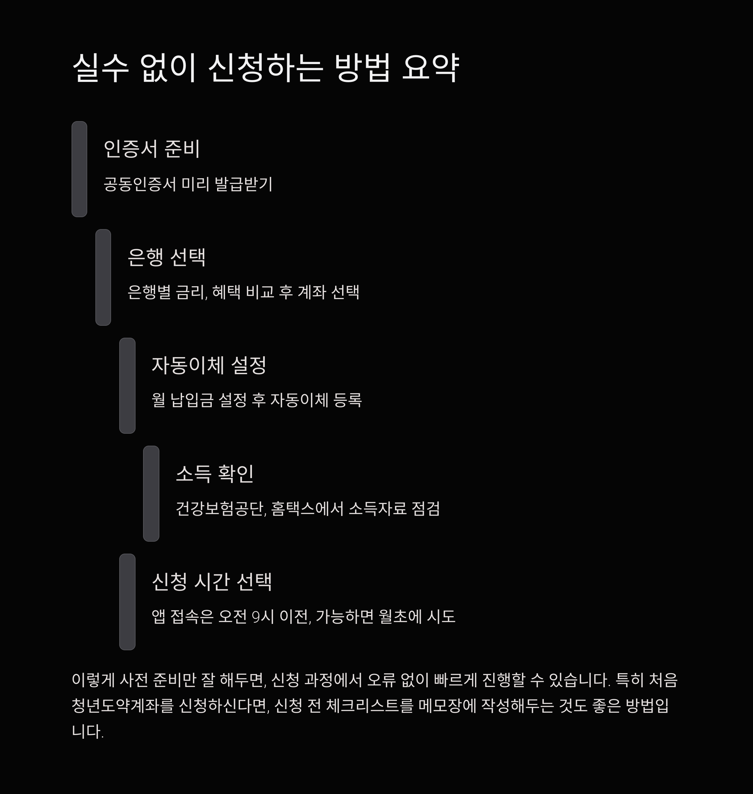 이렇게 사전 준비만 잘 해두면, 신청 과정에서 오류 없이 빠르게 진행할 수 있습니다. 특히 처음 청년도약계좌를 신청하신다면, 신청 전 체크리스트를 메모장에 작성해두는 것도 좋은 방법입니다.