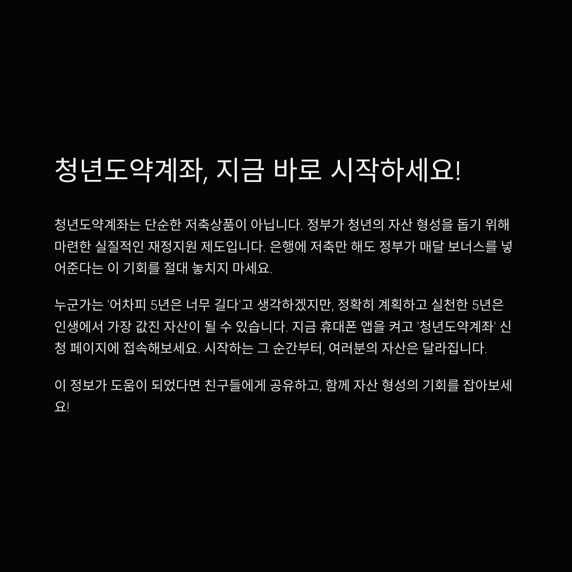 청년도약계좌는 단순한 저축상품이 아닙니다. 정부가 청년의 자산 형성을 돕기 위해 마련한 실질적인 재정지원 제도입니다. 은행에 저축만 해도 정부가 매달 보너스를 넣어준다는 이 기회를 절대 놓치지 마세요.