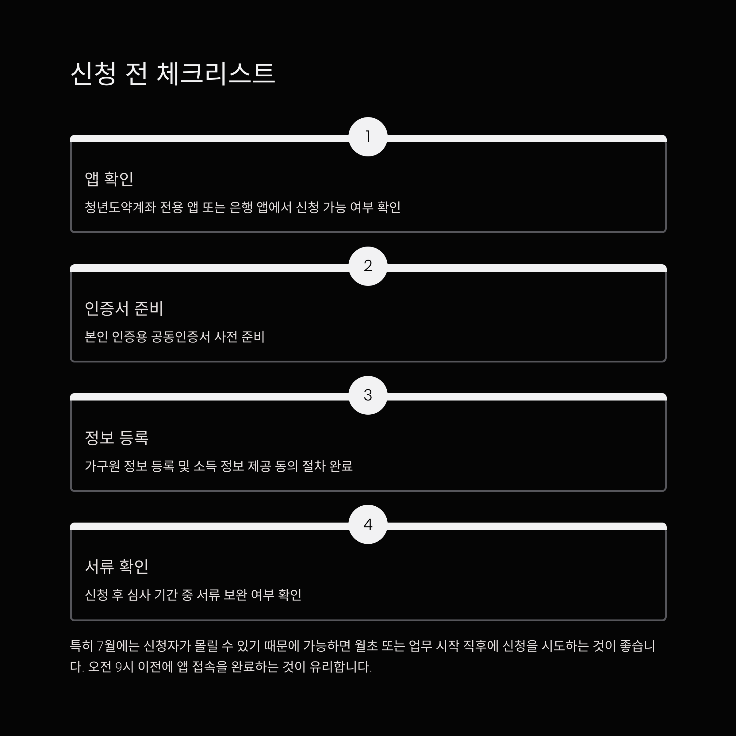 특히 7월에는 신청자가 몰릴 수 있기 때문에 가능하면 월초 또는 업무 시작 직후에 신청을 시도하는 것이 좋습니다. 실제로 접속자 폭주로 신청이 지연되는 사례가 많았기 때문에, 오전 9시 이전에 앱 접속을 완료하는 것이 유리합니다.