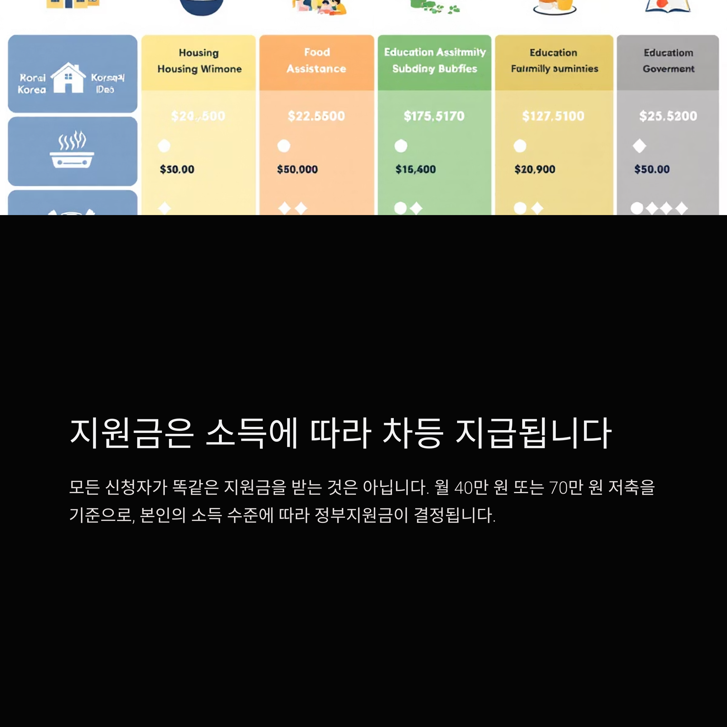 모든 신청자가 똑같은 지원금을 받는 것은 아닙니다. 월 40만 원 또는 70만 원 저축을 기준으로, 본인의 소득 수준에 따라 정부지원금이 결정됩니다.