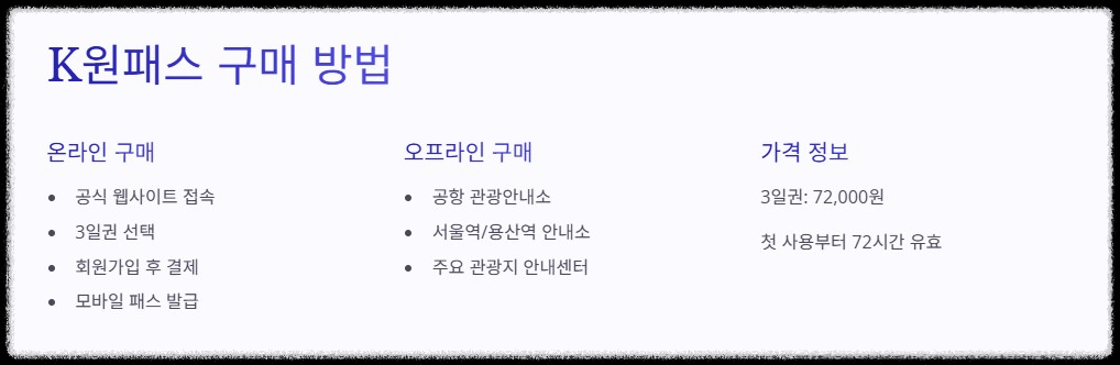서울 3일 여행을 위한 K원패스는 다음과 같이 구매할 수 있습니다:
