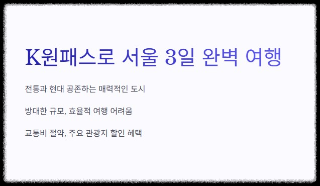 서울은 전통과 현대가 공존하는 매력적인 도시로, 다양한 관광지와 문화를 경험할 수 있는 곳입니다. 하지만 방대한 도시 규모와 수많은 관광지로 인해 짧은 시간 내에 효율적으로 여행하기가 쉽지 않죠. 이에 K원패스를 활용한 서울 3일 완벽 여행코스를 소개합니다. 교통비 절약은 물론, 주요 관광지 할인까지 누리며 서울을 제대로 즐기는 방법을 알아보겠습니다.