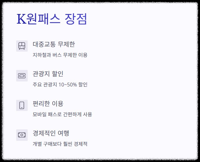 대중교통 무제한 이용: 지하철과 버스를 무제한으로 이용할 수 있어 교통비를 크게 절약할 수 있습니다.
